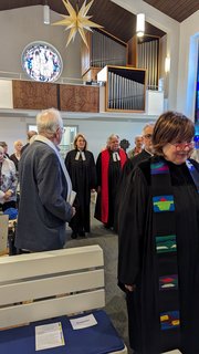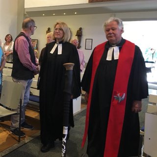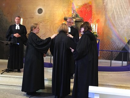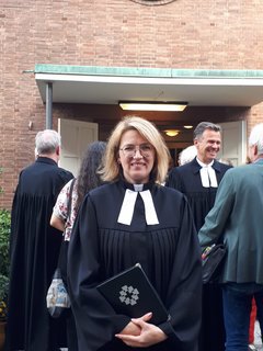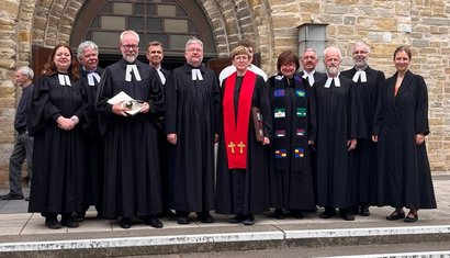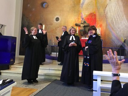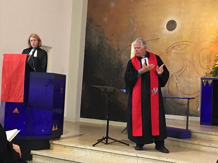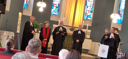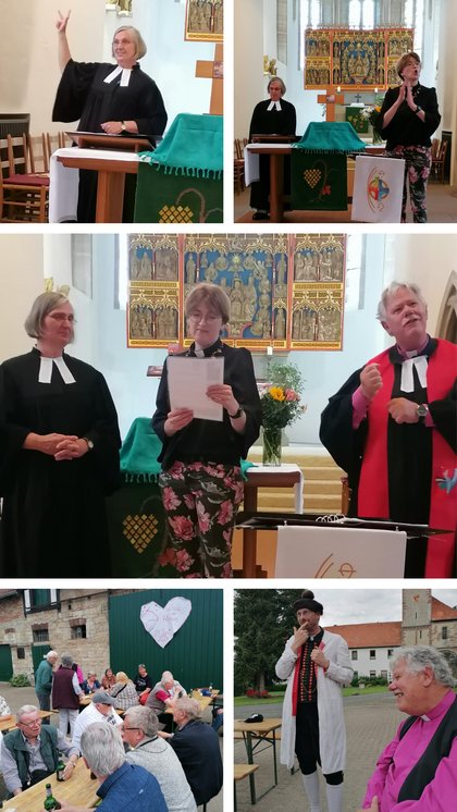 Mit toller Unterstützung von vielen Kolleginnen und Kollegen wurde dieses Fest gestaltet. Aus vielen weit entfernten Ecken Deutschlands kamen sie: Pastor Gerriet Neumann aus Oldenburg, Pastorin i.R. Christiane Neukirch aus Hannover, Pastor Bernd Klein aus Osnabrück und Pastorin Christine Schirrmacher aus Langlingen. Mit Musik, Gebärden und reichlich Segen haben wir in der Theodor-Fliedner Kirche gefeiert. Landeskirchenrat Herr Willenbockel hielt eine Ansprache zur Würdigung der langjährigen Arbeit von Pastor Exner und zur Motivation für die Arbeit von Pastorin Rempel. Besonders gab es in diesem Gottesdienst zwei Predigten. Zuerst sprach Pastor Exner und übergab den "Staffelstab" an Pastorin Rempel. Anschließend wurden beide für ihren weiteren Weg gesegnet.