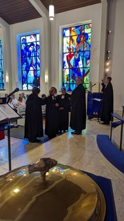 Besonders war dabei, dass während der Predigt das Kreuz „gestaltet“ wurde. Es war nämlich ein Farbenkreuz, ein einzigartiges Standkreuz, das in Form und Farbe stets neu gestaltet werden kann. Das Thema war "Vertrauen leben". Es wurde mit Hilfen vom "guten Hirten" und des Psalms 23 ausgelegt.