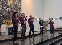 Das Lied „Vom Aufgang der Sonne“ wurde zum Abschluss gemeinsam gestaltet: Der Chor der Gehörlosengemeinde Osnabrück gebärdete den Text, während die hörenden BesucherInnen sangen. Abschließend sprach und gebärdete Bernd Klein selbst den Segen für alle Anwesenden.