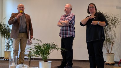 Im Hintergrund sorgten seine Frau Silvia Klein und die Gemeinde vor Ort dafür, dass alles reibungslos ablief und alle Gäste gut versorgt wurden. Und die Grußworte hat die Lehrerin von LBZfH Osnabrück Ina Barrenpohl-Förster in DGS übersetzt.